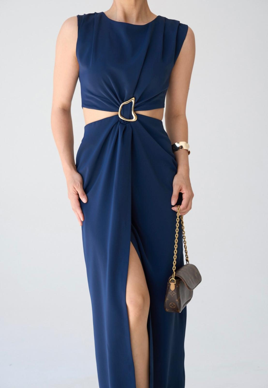 BEL DEKOLTELİ TOKALI ŞIK ELBİSE LACİVERT
