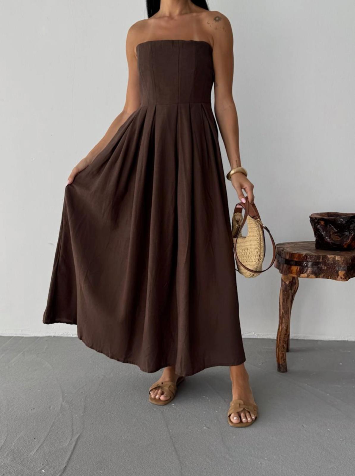 PREMİUM STRAPLEZ KETEN CEPLİ ELBİSE KAHVE